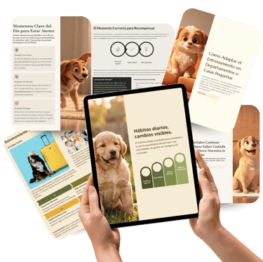 Además del método completo “Hábitos diarios, cambios visibles”, también recibirás 4 bonos exclusivos que te ayudarán a aplicar el sistema desde el primer día y acelerar el aprendizaje de tu perro.